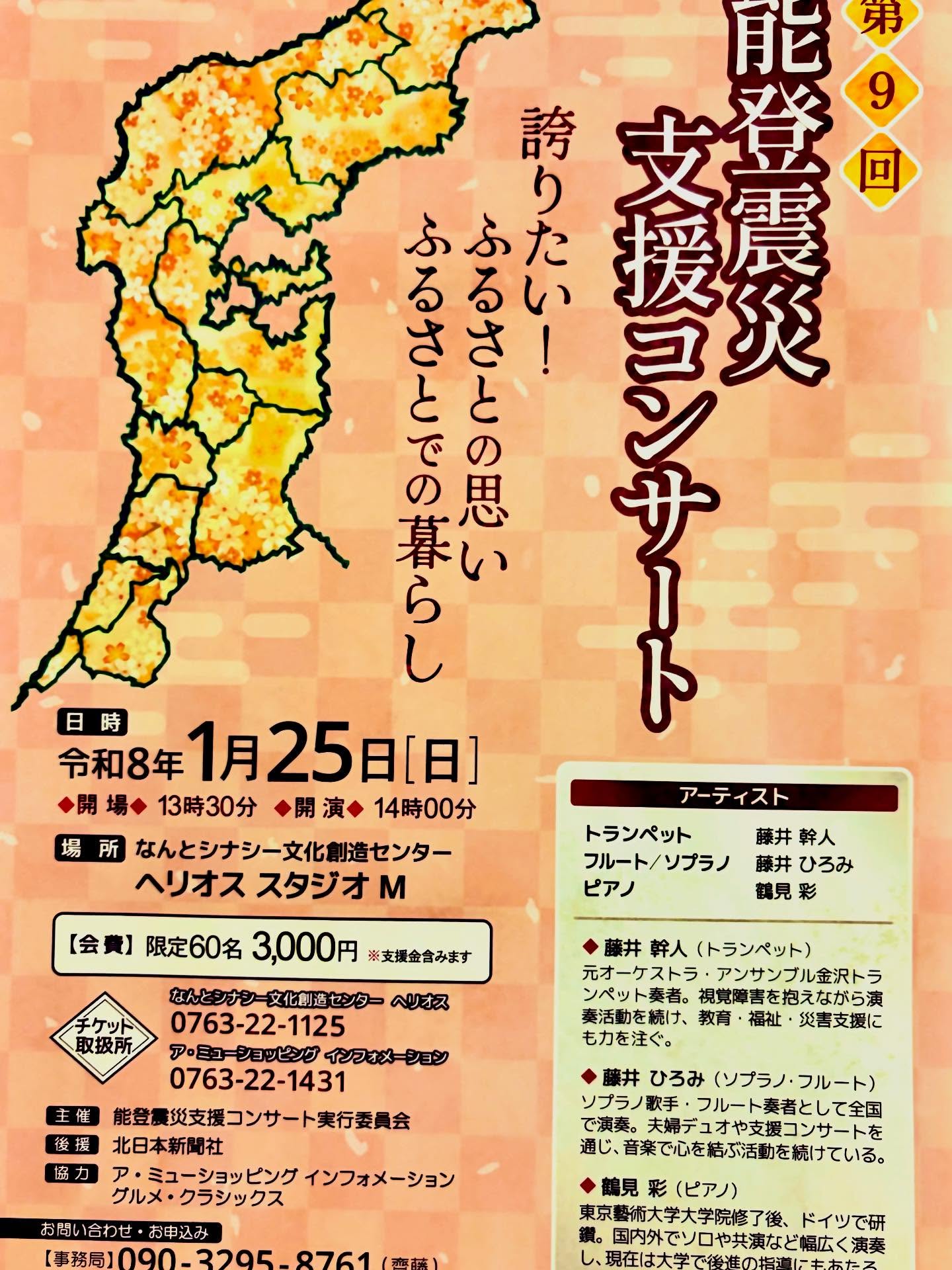 能登震災支援コンサート実行委員会主催の復興支援コンサートに出演いたします。